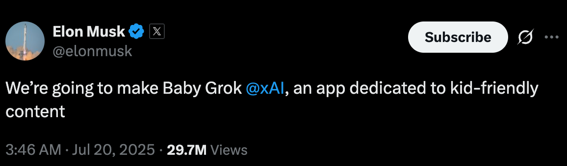 heard about Baby Grok, Elon’s recent move on AI? what does it say about how interesting our children’ attention is? what is this new model built for exactly? what use cases?