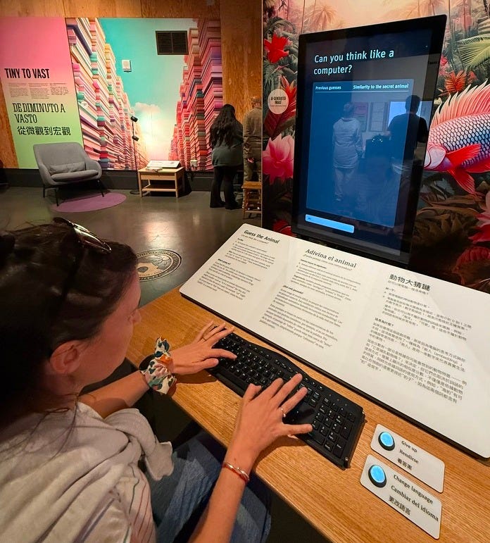 👆 should I admit I got completely addicted here? “Think like a computer” was the most thrilling (and frustrating!) part of the exhibition. Do you play that game with your children : think about something, and with only yes or no questions, I will find what it is? That is the game. Except animals only. For each submission, the machine gives you a % of how close you are to spotting the right animal. Simple, right? It is FREAKING IMPOSSIBLE to think in vectors like machines do. If you don’t believe me, make a guess with what you know above, I’ll see you in the notes to share the answer 😎