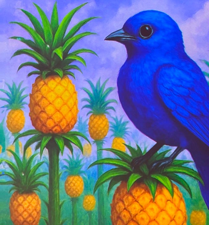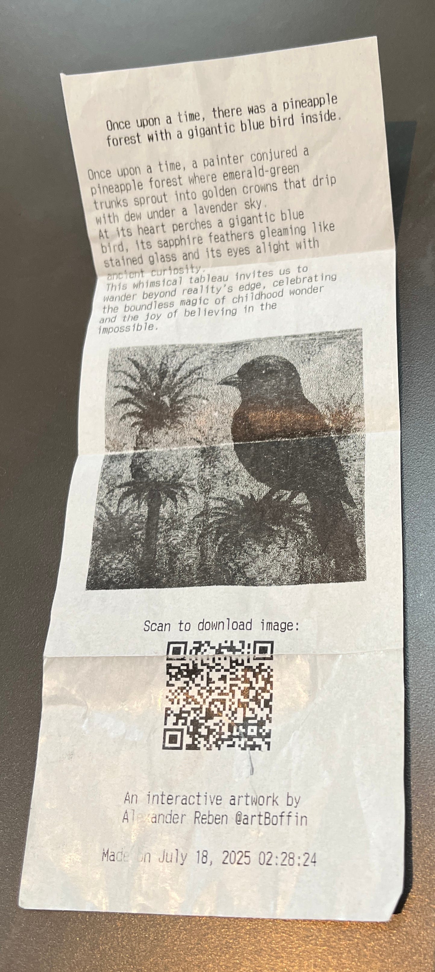 👆 me voice-prompting (in french, had to see if it worked with other languages too!) “Il était une fois, dans une forêt d’ananas, un immense oiseau bleu” ; and then it appeared on the screen, that immense blue bird in a pineapple forest. I also printed a ticket as a souvenir. Artistic co-creation 🪄