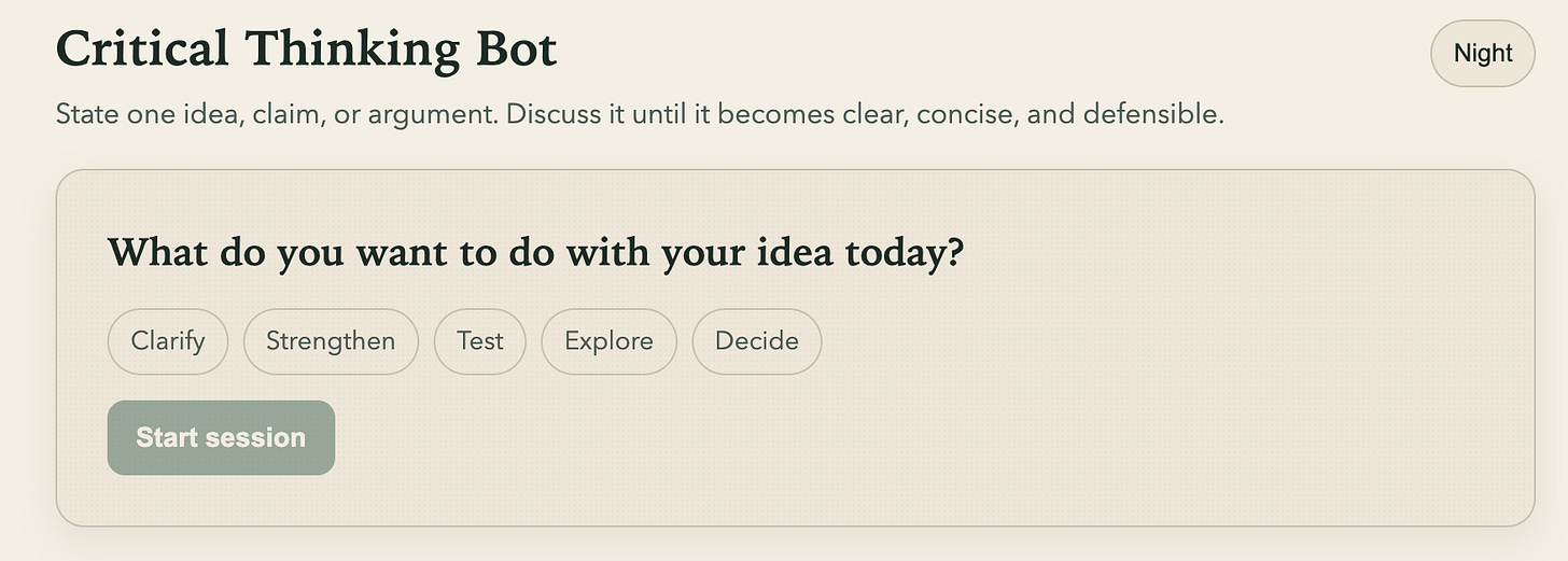 Shae O. is one of my favorite writers these days. She’s obsessed with helping humans cultivate agency and critical thinking in the age of AI. She has developed the Critical Thinking Bot, a free tool to help you play with your thoughts: